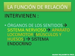 Los órganos de los sentidos, el sistema nervioso, el aparato locomotor formado por los músculos y huesos, y el sistema endocrino intervienen en la función de relación. Los órganos de los sentidos captan información a través de células receptoras y los nervios la transmiten al cerebro. El sistema nervioso está formado por neuronas y coordina los movimientos voluntarios e involuntarios. El sistema endocrino regula procesos internos a través de hormonas producidas por glándulas.