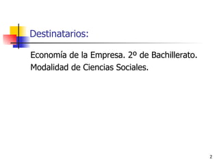 Este documento presenta una lección sobre economía de la empresa para estudiantes de segundo año de bachillerato. Los objetivos son relacionar la escasez de materias primas con las necesidades crecientes, determinar la cantidad a producir considerando la capacidad y política de stocks, y calcular y clasificar los distintos tipos de costes. La lección cubrirá el proceso productivo, productividad, eficiencia, costes de la empresa y planificación de la producción. Las actividades incluyen ver un documental sobre guerras por materias primas, debatir sobre