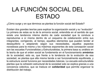 El documento discute el origen y función social del Estado. Explica que el Estado surge para resolver conflictos sociales internos, especialmente en torno a la apropiación de excedentes de producción. El Estado organiza y activa la cooperación social en un territorio determinado, estableciendo orden y armonizando los intereses opuestos dentro de esa zona geográfica. Su función principal es mantener la paz y justicia social entre los ciudadanos.
