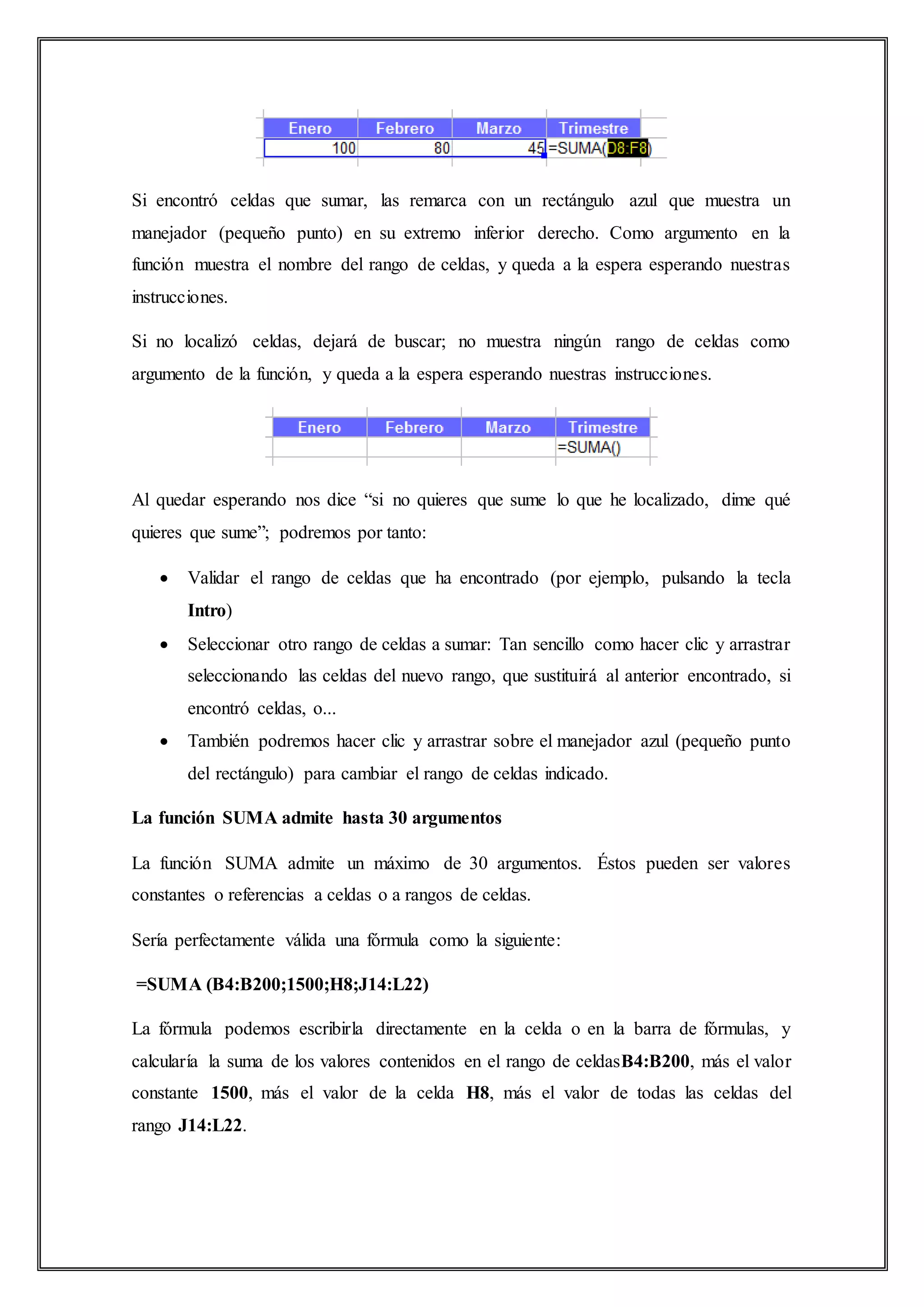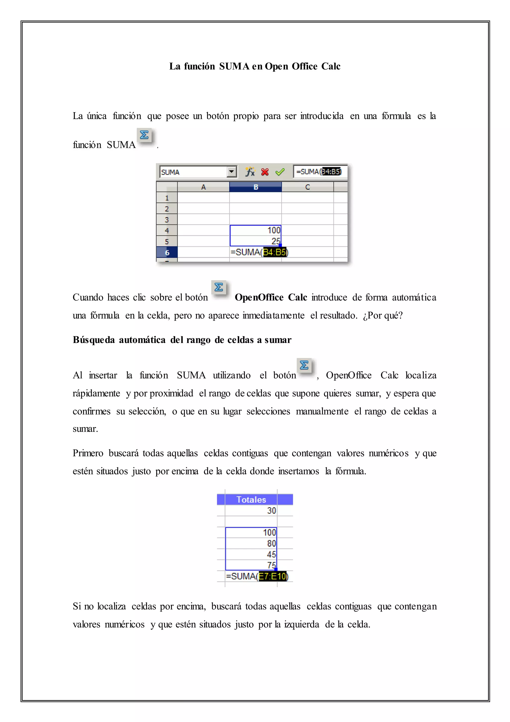 La función SUMA en OpenOffice Calc permite sumar hasta 30 valores o rangos de celdas. Al insertar SUMA mediante el botón, Calc busca automáticamente celdas contiguas con valores para sumar y las resalta, permitiendo al usuario confirmar o cambiar el rango. Si no encuentra celdas, deja la función vacía para que el usuario introduzca el rango manualmente.