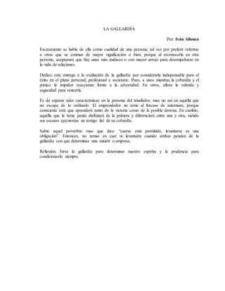 Este documento describe la gallardía como una cualidad indispensable para el éxito personal y profesional. La gallardía permite afrontar la adversidad con valentía y sagacidad en lugar de cobardía y pánico. Las personas con éxito no temen al fracaso porque saben que aprenderán tanto de la victoria como de la derrota. La cobardía, en cambio, impide disfrutar del triunfo y aprender de los errores. El proverbio ruso recuerda que caer está permitido siempre que uno se levante, lo cual depende de