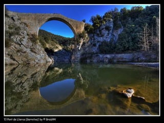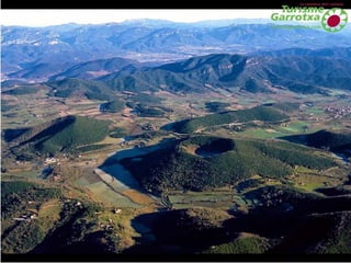 La Garrotxa es una comarca catalana situada en la provincia de Gerona, limita con otras 7 comarcas. Está dividida en Alta y Baja Garrotxa. La Alta presenta valles estrechos entre altos riscos, mientras la Baja es más suave debido a la actividad volcánica. El Parque Natural de la Zona Volcánica de la Garrotxa protege 38 conos volcánicos y paisajes volcánicos, siendo el mejor ejemplo de este paisaje en la península ibérica. Olot es la