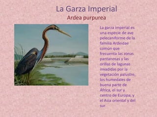 La Garza Imperial es una especie de ave pelecaniforme común en zonas pantanosas y orillas de lagunas en partes de África, sur y centro de Europa, y el este y sur de Asia. Mide más pequeña que la garza real, se alimenta principalmente de peces y ranas aunque también come otros animales, y construye nidos voluminosos de tallos secos donde pone entre 3 y 6 huevos.