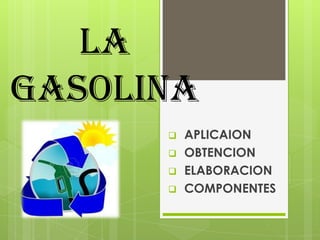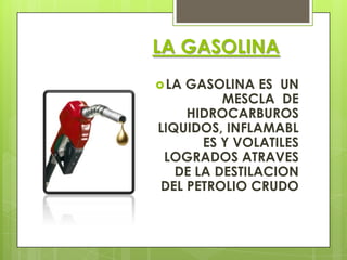 La gasolina se obtiene de la destilación fraccionada del petróleo crudo y se utiliza como combustible en motores de combustión interna. Se compone principalmente de hidrocarburos líquidos inflamables y volátiles. Su octanaje determina su resistencia a la detonación, siendo usualmente de 95 a 98.