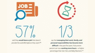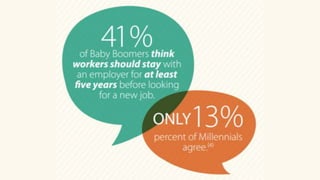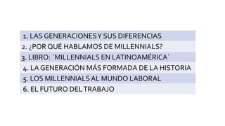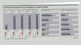 El documento analiza la generación de los millennials, nacidos entre 1982 y 1998, resaltando su influencia demográfica y laboral, así como su conexión natural con la tecnología. Destaca sus valores en el entorno laboral, que priorizan la flexibilidad, la formación continua y el propósito social de las empresas. También aborda cómo la próxima revolución industrial y la automatización afectarán el mercado laboral, requiriendo una adaptación constante y nuevas habilidades.
