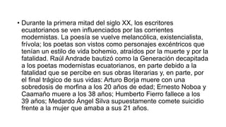 La Generación Decapitada se refiere a un grupo de poetas ecuatorianos modernistas de la primera mitad del siglo XX que se caracterizaron por tener una vida bohemia, atraídos por la muerte y la fatalidad. Sus obras literarias reflejaban melancolía y existencialismo. La mayoría de estos poetas como Arturo Borja, Ernesto Noboa y Caamaño, Humberto Fierro y Medardo Ángel Silva tuvieron una vida trágica y fallecieron a temprana edad, entre los 20 y 39 años, lo que llev