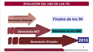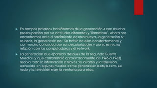 Este documento describe las características de la generación nacida después de 1977, conocida como generación N o generación Net. Prefieren las computadoras y la tecnología a la televisión, crecieron junto a las computadoras desde la infancia, y son muy hábiles manejando dispositivos digitales y redes. Se destaca que son creativos, independientes, y están liderando la revolución digital.
