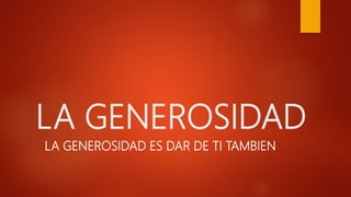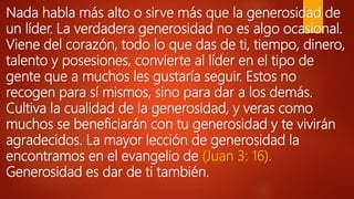 La generosidad es un valor fundamental en el liderazgo, que implica dar de uno mismo sin esperar nada a cambio. Se enfatiza que la verdadera satisfacción proviene de ser generoso y poner a los demás primero, así como de tener una relación saludable con el dinero. Fomentar el hábito de dar es esencial para cultivar la generosidad y alcanzar una vida plena y feliz.