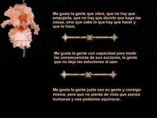El poema describe las cualidades que le gustan en la gente, incluyendo que sean personas que vibran y saben qué hacer sin necesidad de empujarlas, que miden las consecuencias de sus acciones y no dejan las soluciones al azar, y que prefieren el trabajo en equipo a los esfuerzos individuales. También aprecia la gente sincera, de criterio, y fiel que no desfallece al tratar de alcanzar objetivos e ideas.