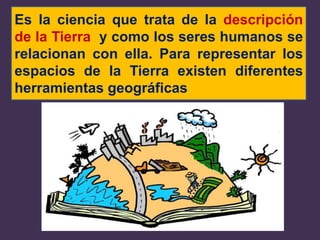 La geografía estudia la descripción de la Tierra y la relación de los seres humanos con ella. Existen diferentes herramientas para representar los espacios de la Tierra como los planos, mapas, cortes y fotografías. Los planos y mapas se usan para ubicar lugares y objetos, mientras que los cortes muestran el relieve verticalmente y las fotografías proporcionan información sobre el paisaje, clima, flora y fauna de una región.