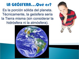 Este documento proporciona información sobre la geósfera, que es la porción sólida del planeta y está compuesta por la corteza, el manto y el núcleo. Explica que la tectónica de placas es la teoría que describe cómo se mueven y interactúan las placas tectónicas, lo que da forma al relieve terrestre. También cubre brevemente los sismos, volcanes y la deriva continental.