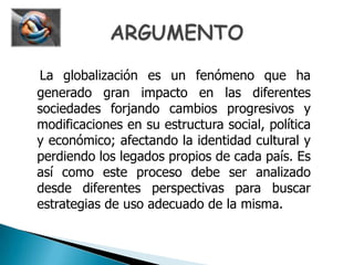 La globalización es un fenómeno que ha transformado las estructuras sociales, políticas y económicas de diversas sociedades, generando tanto ventajas como desventajas. Este proceso implica una creciente interdependencia entre países y presenta representaciones variadas, desde oportunidades de desarrollo hasta riesgos de dependencia y desigualdad. Es esencial que cada sociedad reflexione sobre cómo manejar estos cambios para preservar su identidad y bienestar.
