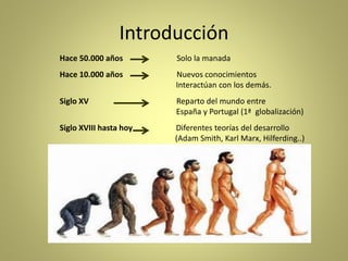 Este documento resume la globalización comercial. Define la globalización como el proceso por el cual la comunicación e interdependencia entre países unifica mercados, sociedades y culturas a través de transformaciones sociales, económicas y políticas. Explica las cualidades de la globalización y cómo ha afectado el desarrollo de países periféricos, semiperiféricos y del centro. También discute los efectos positivos como la eliminación de fronteras y los negativos como la desigualdad económica.