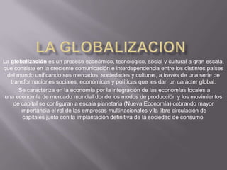 La globalización es un proceso económico, social y cultural a gran escala que consiste en la creciente comunicación e interdependencia entre países a través de transformaciones que les dan un carácter global. Se caracteriza por la integración de economías locales en una economía de mercado mundial donde los movimientos de capital y las empresas multinacionales cobran mayor importancia. Aunque comenzó antes, el proceso de globalización se aceleró con el fin de la Guerra Fría y la desaparición de la Unión Soviética.