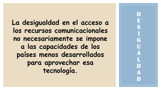 El documento discute cómo la globalización y el Internet están presionando hacia arriba y hacia abajo, creando nuevas oportunidades y desafíos. Mientras la desigualdad en el acceso a la tecnología persiste entre países, el Internet también ha abierto nuevas formas de solidaridad global y expresión local. Si bien existen brechas digitales, las nuevas tecnologías también representan una oportunidad para que los países se conecten globalmente y compartan cultura de manera más equitativa.