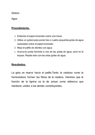 El experimento demuestra la fuerza de atracción entre moléculas de agua mediante la observación de cómo una gota se mueve hacia un palillo húmedo. Se utiliza papel encerado, un palillo de dientes y un gotero para llevar a cabo la práctica. La atracción molecular se explica por la polaridad de las moléculas de agua, donde un lado positivo atrae al lado negativo de otra.