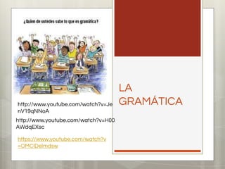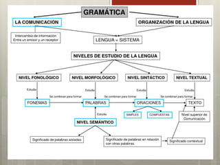 La gramática estudia la estructura y el funcionamiento de las palabras y oraciones. Se divide en normativa, que establece las normas del lenguaje, y descriptiva, que describe su uso sin establecer normas. También se divide en fonología, fonética, morfología, sintaxis, semántica. La RAE establece las normas iniciales de la gramática normativa de español.