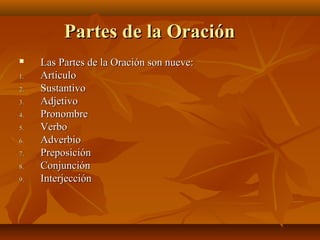 Este documento describe las nueve partes de la oración en español - artículo, sustantivo, adjetivo, pronombre, verbo, adverbio, preposición, conjunción e interjección. Para cada parte, se proporciona una breve definición y algunos ejemplos.