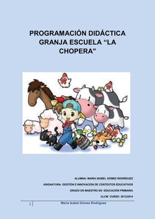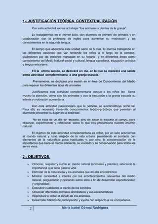 Este documento presenta una programación didáctica para una unidad sobre animales y plantas de la granja en un primer curso de primaria. La unidad se desarrollará a lo largo de 5 días e incluirá una visita a una granja escuela. Los objetivos son que los estudiantes aprendan sobre los animales y plantas, desarrollen su vocabulario en inglés, y valoren la importancia del medio ambiente. La unidad incluirá lecciones, actividades prácticas como dibujos y la visita a la granja, y será evaluada