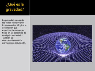 La gravedad es una de las cuatro interacciones fundamentales que origina la aceleración de los cuerpos físicos cercanos a objetos astronómicos. Albert Einstein reformuló el concepto de gravedad en su teoría de la relatividad general de 1915. Isaac Newton había presentado previamente la ley de la gravitación universal en 1687 para describir la interacción gravitatoria entre cuerpos con masa.