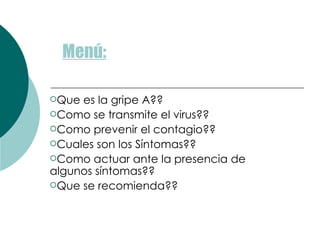 El documento habla sobre la gripe A. Explica que es un virus respiratorio altamente contagioso que puede afectar a cualquier persona pero especialmente a embarazadas, personas con bajas defensas o enfermedades crónicas. Se transmite a través de gotas al toser, estornudar o hablar cerca de otros. Para prevenir, se recomienda lavarse las manos frecuentemente, evitar tocarse la cara y mantener una buena higiene. Los síntomas incluyen fiebre alta, tos, dolores musculares
