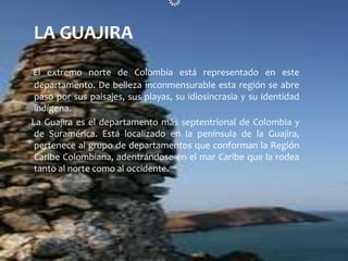Este documento proporciona información sobre el departamento de La Guajira en Colombia. La Guajira es el departamento más septentrional de Colombia y de Suramérica, localizado en la península de La Guajira. La región se caracteriza por sus paisajes, playas, cultura e identidad indígena de la comunidad Wayuu. La historia de La Guajira se remonta a 1498 cuando fue explorada por primera vez, y ha pasado por varios cambios administrativos hasta convertirse en un departamento en 1965.