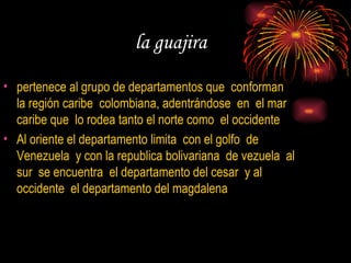 La Guajira se encuentra en la región caribeña de Colombia y limita con el mar Caribe y Venezuela. El clima es cálido, con temperaturas entre 27-30°C y máximas de 45°C. Históricamente estaba habitada por los wayuu y wiwa. El español es el idioma oficial pero el wayuunaiki es co-oficial debido a que los wayuu representan más del 40% de la población. También se hablan otros idiomas indígenas como el damana y el koguian.