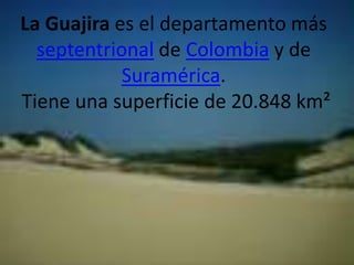 La Guajira es el departamento más septentrional de Colombia, con un clima árido y vegetación de cactus. La población actual está compuesta principalmente por indígenas wayuu y mestizos. La economía se basa en la minería de carbón y el turismo se centra en destinos naturales como el Cabo de la Vela y el santuario de flamencos.