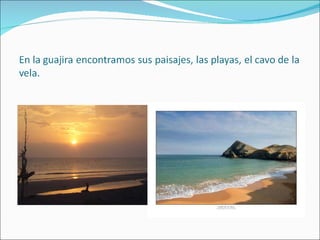 Este documento describe la economía y el traje típico de la Guajira. La economía depende de la minería de carbón y sal, la agricultura de arroz, maíz y otros cultivos, y la ganadería caprina. El traje típico de la Guajira es la manta, originada por la influencia de los barcos holandeses e ingleses que buscaban perlas en la región.