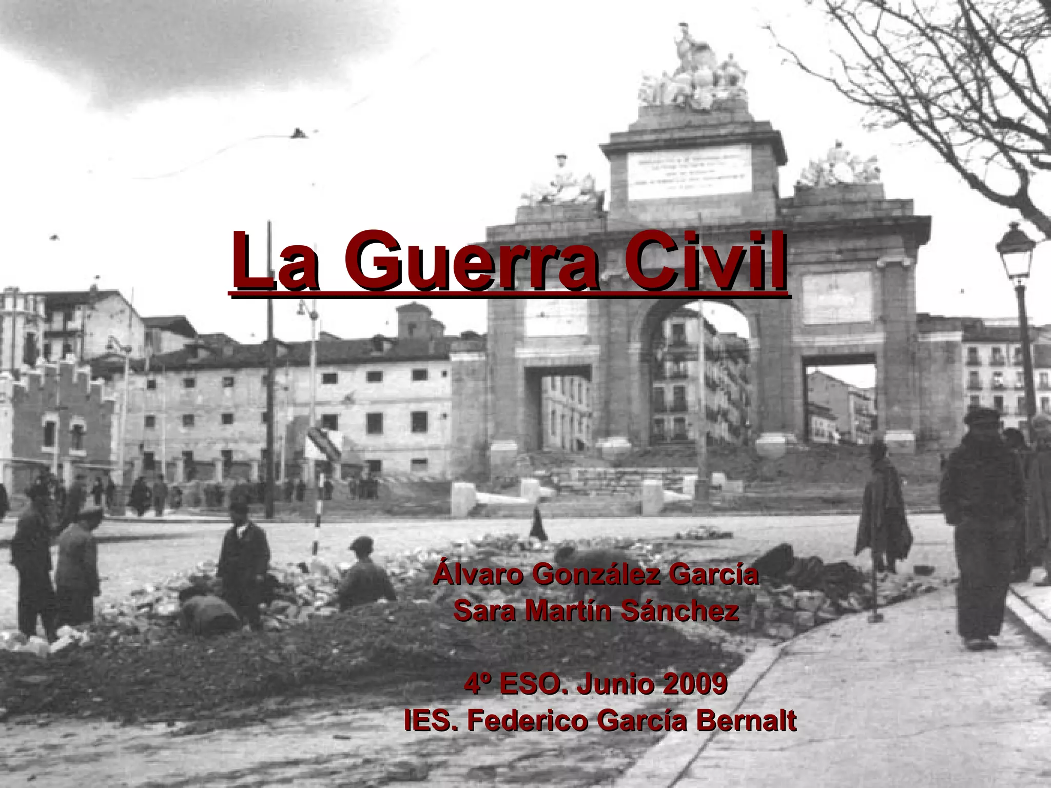 La Guerra Civil Española estalló en 1936 como resultado de un golpe de estado militar contra el gobierno republicano y dividió a España en dos zonas controladas por facciones opuestas. Los sublevados, liderados por Francisco Franco, recibieron apoyo de Italia y Alemania mientras que la República contó con brigadas internacionales. La guerra culminó en 1939 con la victoria de Franco y el exilio de los republicanos.