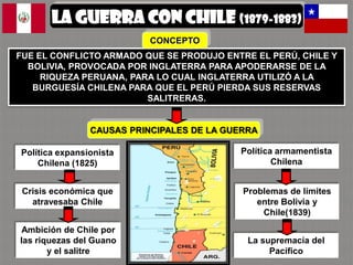La guerra entre Perú, Chile y Bolivia se debió a la ambición expansionista de Chile y su deseo de apoderarse de los recursos del salitre y el guano peruano. Tras la declaración de guerra de Chile al Perú en 1879, las campañas marítima y terrestre resultaron en victorias chilenas que le permitieron tomar el control de Tarapacá, Tacna y Arica. El conflicto finalizó en 1883 con la firma del Tratado de Ancón, en el que Perú cedió territorio a Chile y sufrió graves consecuencias econó
