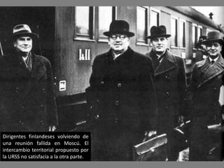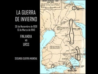 Este documento describe la Guerra de Invierno entre Finlandia y la Unión Soviética a través de varias imágenes. Muestra las negociaciones fallidas entre los líderes finlandeses y soviéticos, el bombardeo de Helsinki por las tropas soviéticas, y las defensas finlandesas a lo largo de la Línea Mannerheim. También describe las tácticas y equipamiento de ambos lados, incluyendo la ventaja numérica inicial de tanques del Ejército Rojo sobre Finlandia, y cómo Finlandia eventualmente se r
