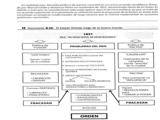 Este documento resume la Guerra Grande (1839-1851) entre Argentina y Uruguay de las siguientes maneras: 1) Comenzó como un conflicto entre los partidos Blanco y Colorado pero luego se internacionalizó involucrando a potencias europeas como Francia e Inglaterra. 2) No había claridad sobre quién defendía la independencia uruguaya ya que ambos bandos políticos la apoyaban aunque de diferentes formas. 3) La guerra definió más a los partidos políticos uruguayos pero sus programas inicialmente eran similares.