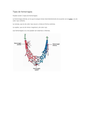 La hemorragia se define como la salida de sangre del sistema cardiovascular debido a la ruptura de vasos sanguíneos como venas, arterias y capilares. Puede ser interna, dentro del cuerpo, o externa, a través de la piel. Existen diferentes tipos de hemorragia clasificadas según su origen (interna, externa o a través de orificios naturales), el tipo de vaso sanguíneo afectado (capilar, venosa o arterial, siendo esta última la más grave) y su causa (rotura, incisión quirú