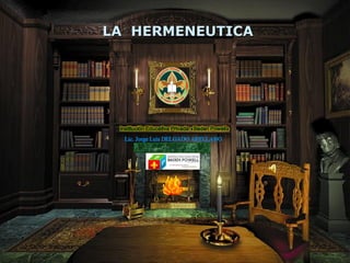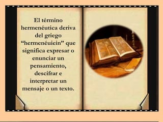 La hermenéutica se refiere a la interpretación y comprensión de textos y acciones humanas. Surge del griego "hermenéuiein" que significa expresar o enunciar un pensamiento. La hermenéutica considera que el ser es lingüístico e histórico, por lo que todo conocimiento es parcial y está condicionado por prejuicios. Los hermenéuticos ven el mundo como un texto que debe ser interpretado.