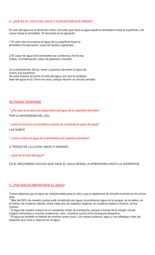 La hidrosfera es la masa total de agua en la Tierra, que cubre el 75% de la superficie. Esta agua se presenta en dos tipos: agua continental como ríos y lagos, y agua oceánica en los mares, siendo esta última la más abundante. El agua sigue un ciclo continuo entre la atmósfera y la superficie a través de la evaporación, condensación y precipitación.