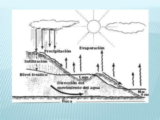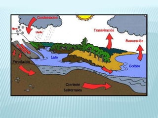 El documento trata sobre la hidrosfera. Explica que el agua se encuentra en los estados sólido, líquido y gaseoso en la Tierra y cubre las tres cuartas partes de su superficie. Describe también la distribución del agua, el ciclo hidrológico, el papel del agua en la naturaleza y los seres vivos, los usos del agua y la gestión sostenible de los recursos hídricos.