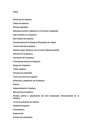 Este documento provee una definición general de hipoteca y clasifica las diferentes clases de hipoteca. Define hipoteca como una garantía real que recae sobre bienes inmuebles y requiere inscripción registral. Clasifica las hipotecas en mobiliaria e inmobiliaria, general y especial, convencional y legal, e inscrita y oculta. También describe los elementos de una hipoteca y las normas aplicables como el Código Civil Peruano y la Ley Hipotecaria.