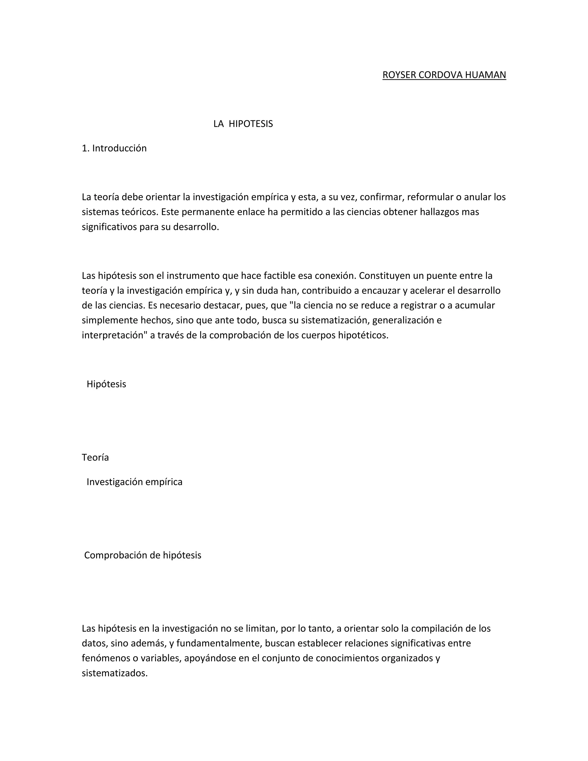 El documento describe los tipos y funciones de las hipótesis en la investigación científica. Explica que las hipótesis son un puente entre la teoría y la investigación empírica, orientando la recopilación de datos y estableciendo relaciones entre variables. Describe tres tipos de hipótesis: descriptivas de una variable, descriptivas de asociación entre variables, y de relación causal entre variables. Además, señala los requisitos para plantear hipótesis de manera adecuada y poder verificarlas empíricamente.