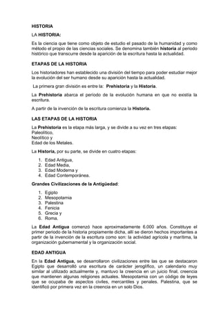 Este documento resume las principales etapas de la historia humana, dividiéndola en Prehistoria e Historia. La Prehistoria incluye la Edad de Piedra y la Edad de los Metales, mientras que la Historia se divide en Edad Antigua, Edad Media, Edad Moderna y Edad Contemporánea. Se describen las características y civilizaciones más importantes de cada etapa.