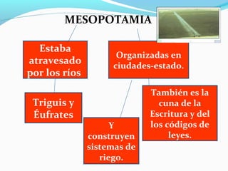 El documento describe las principales civilizaciones antiguas de Mesopotamia, Egipto y Grecia. Mesopotamia se desarrolló entre los ríos Tigris y Éufrates, con ciudades-estado que construyeron sistemas de riego. Egipto estuvo gobernado por los faraones y construyeron las pirámides. Grecia fue cuna del arte clásico y se organizó en polis alrededor del Mediterráneo. Roma conquistó la cuenca mediterránea y sometió los territor