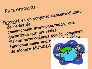 El documento resume la historia de Internet desde sus inicios en la década de 1960 como una red militar estadounidense llamada ARPANET hasta su popularización a nivel mundial en la década de 2000. Algunos hitos clave incluyen el desarrollo del correo electrónico y el protocolo TCP/IP en la década de 1970, la creación de Usenet en 1979, y el lanzamiento del navegador Mosaic en 1993 que facilitó el acceso a la World Wide Web.