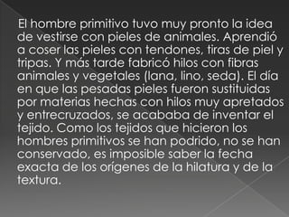 Los primeros humanos usaron pieles de animales para vestirse y aprendieron a coserlas juntos. Más tarde desarrollaron la habilidad de hilar fibras como lana, lino y seda para crear tejidos. Aunque los primeros tejidos se han descompuesto, se han encontrado agujas y cuerdas de hace más de 15,000 años en una cueva en Francia, mostrando que el hilado existía en ese entonces. Con el tiempo, se inventaron herramientas como la rueca y el torno de hilar para mejorar la producción de