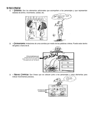 Este documento presenta una introducción a las historietas. Define la historieta como una forma de expresión visual que cuenta historias a través de imágenes y texto, generalmente con un tono humorístico u otro serio. Luego enumera los elementos necesarios para crear una historieta, incluyendo personajes, globos para diálogos, viñetas para cada escena, así como recursos adicionales como símbolos, onomatopeyas y figuras cinéticas.