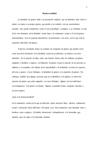 El documento resume conceptos clave relacionados con la homosexualidad, incluyendo la identidad de género, orientación sexual, causas biológicas y sociales de la homosexualidad, historia de la aceptación de la homosexualidad en diferentes culturas y épocas, y salud sexual de personas homosexuales. También define términos como lesbianas, gays, bisexuales, transexuales, roles de género y homofobia.
