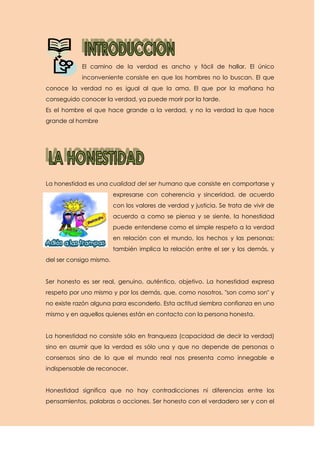 Este documento define la honestidad como comportarse y expresarse con sinceridad y de acuerdo con la verdad y la justicia. Ser honesto implica que no hay contradicciones entre lo que se piensa, dice y hace. La honestidad genera confianza en uno mismo y en los demás. Vivir con honestidad significa actuar de forma congruente con los propios valores y principios.