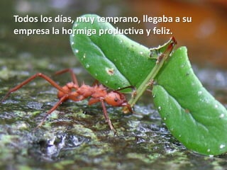 Este documento narra la historia de una hormiga productiva y feliz que trabajaba felizmente hasta que su empresa comenzó a contratar más y más supervisores, gerentes y consultores, creando mucha burocracia. Esto hizo que la hormiga dejara de ser feliz y productiva. Finalmente, debido a un informe de un consultor, la hormiga fue despedida. La moraleja es que si uno quiere ser productivo y feliz, debería tener su propio negocio para no depender de tantos supervisores.