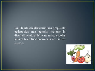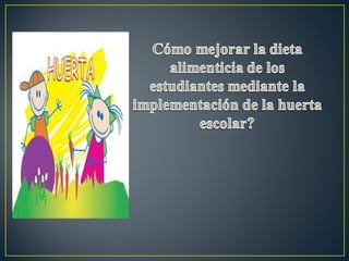 El documento trata sobre la implementación de una huerta escolar en el Centro Educativo El Porvenir en el municipio de Tambo, Cauca, Colombia. La huerta escolar tiene como objetivo mejorar la dieta alimenticia de los estudiantes mediante el cultivo de hortalizas que se usarán en el restaurante escolar. El proyecto involucra a estudiantes, padres de familia y docentes en actividades agropecuarias y busca integrar a la comunidad.
