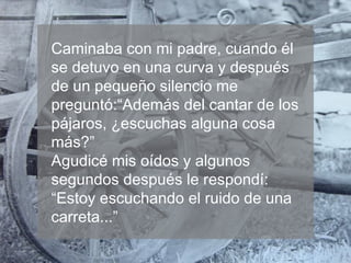 Caminaba con mipadre, cuando él se detuvo en una curva y después de un pequeño silencio me preguntó:“Además del cantar de los pájaros, ¿escuchas alguna cosa más?” Agudicé mis oídos y algunos segundos después le respondí: “Estoy escuchando el ruido de una carreta...”