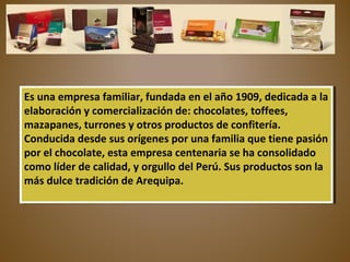 La Ibérica es una empresa familiar peruana fundada en 1909 dedicada a la elaboración y comercialización de chocolates, toffees, mazapanes, turrones y otros productos de confitería. Con más de 100 años de historia, la empresa se ha consolidado como líder en calidad en Perú y cuenta con una fábrica moderna, tiendas propias y una amplia red de distribución.